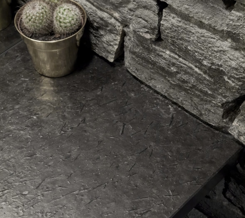 Den børstede overflaten gir skiferen et eksklusivt og moderne uttrykk. Naturoverflaten freses og børstes skånsomt, noe som gir en jevn, silkemyk og lett glansfull overflate – uten å miste steinens naturlige karakter.